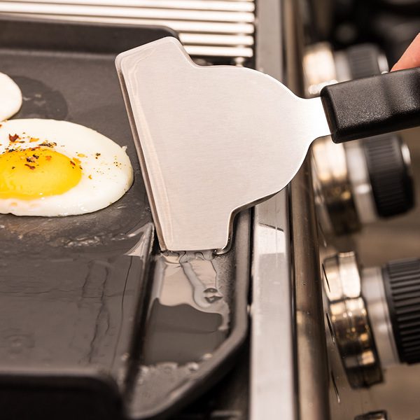 This plancha and griddle scraper was specifically designed to clean deep into the corner of your Broil King® Plancha then scrape out the entire grease trough. Featuring a stainless steel blade and hard resin handle embossed with Broil King® logo. Easy to clean and dishwasher safe.